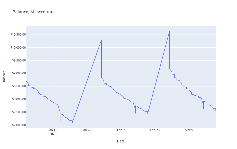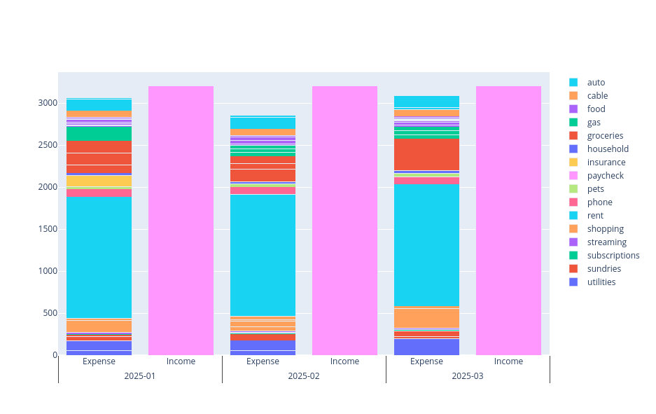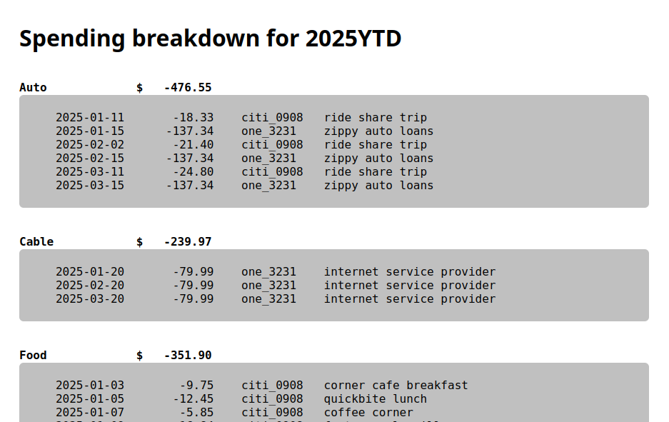 With that workflow, the initial categorizations might have taken a while, but after collecting enough pattern-category pairs, my current sessions fly by as I buy from the same locations. Each month the process takes about 30 minutes, most of which is spent downloading the CSVs from my six institutions and paying a few bills as I go.